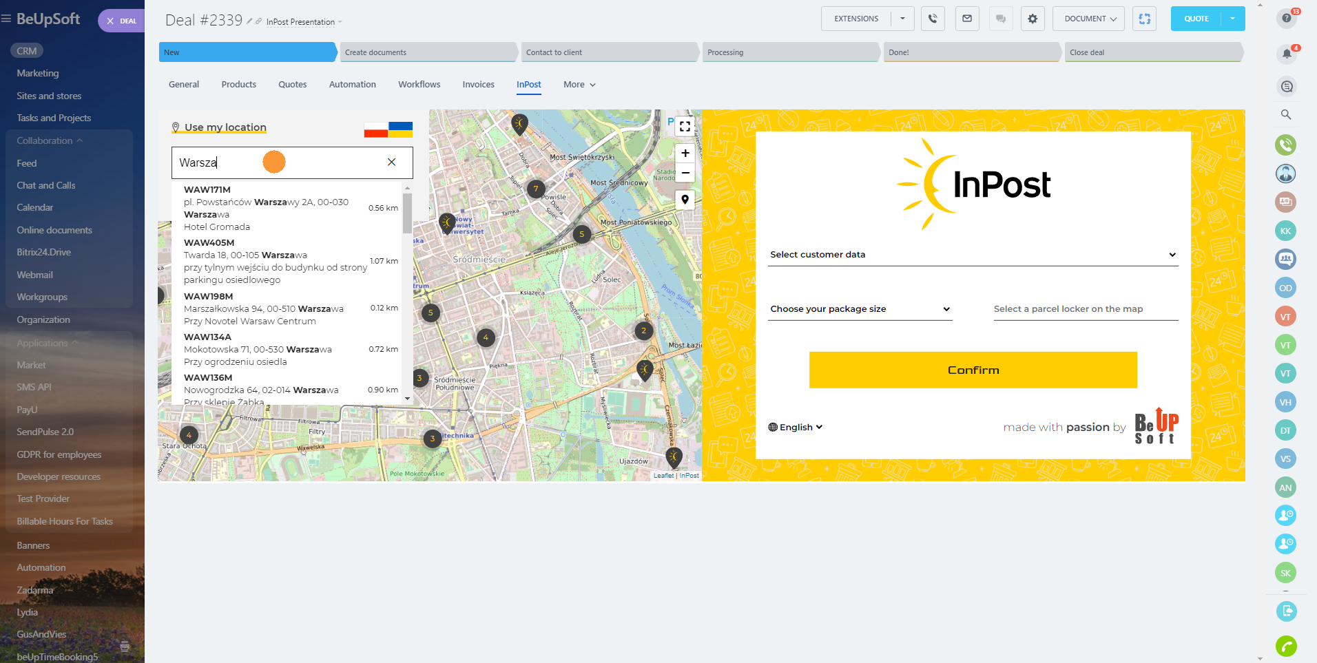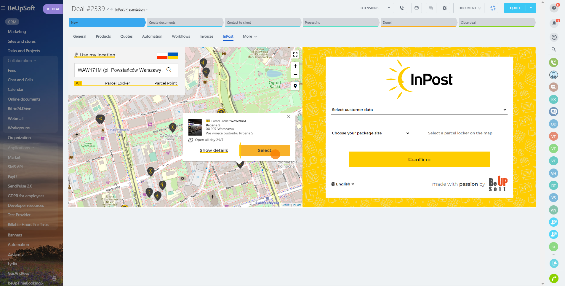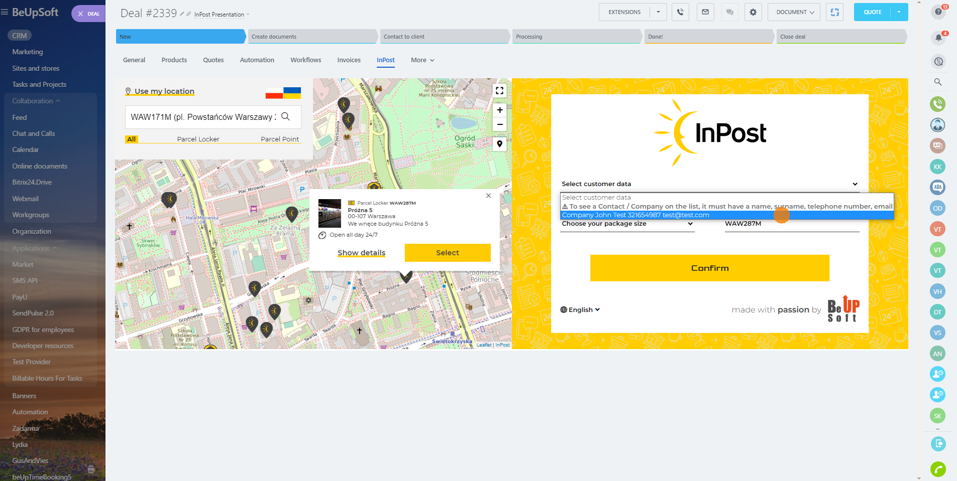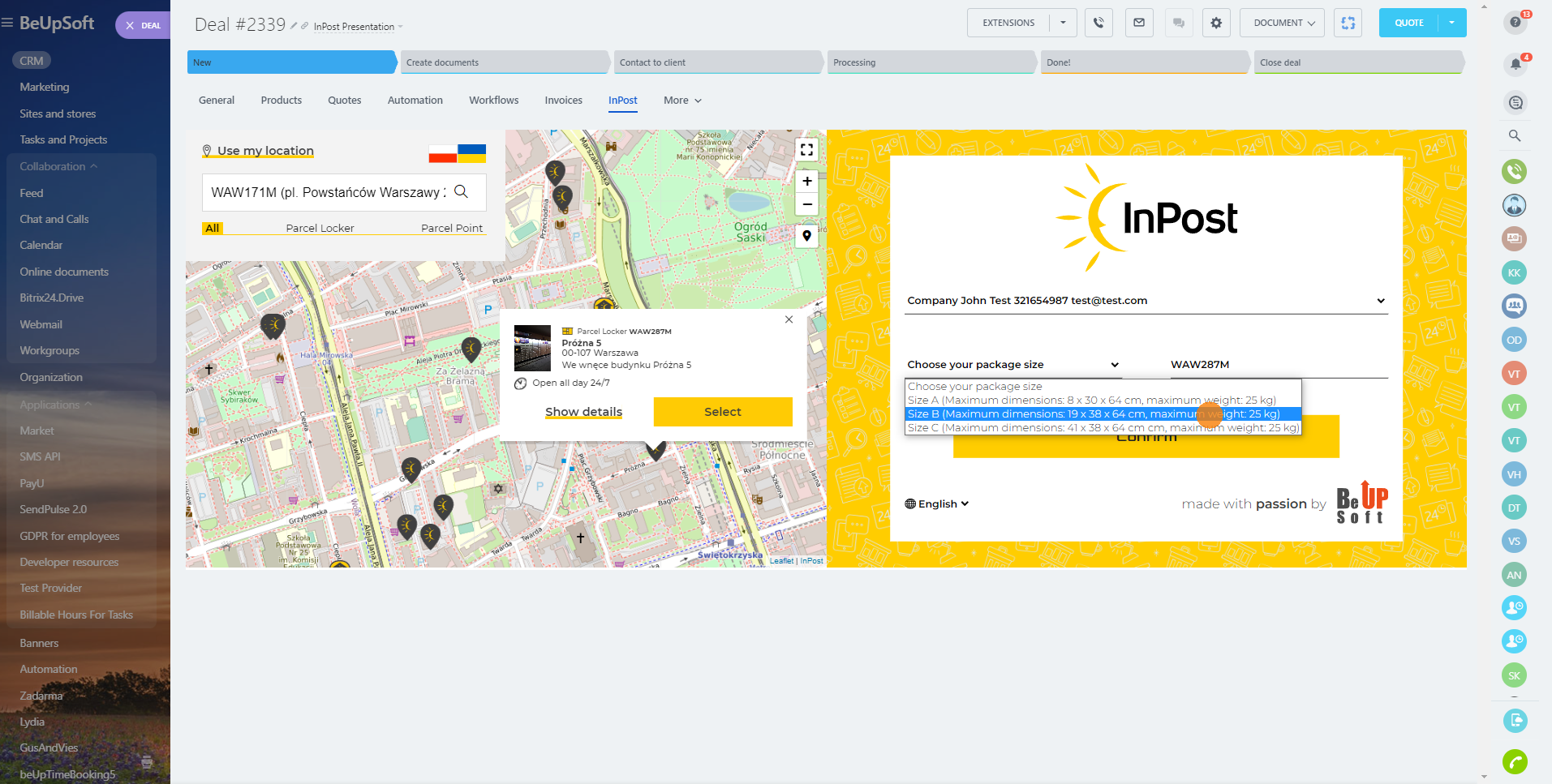 Application sends Your parcel directly from Bitrix24 deal interface. Sel ect customer/company address, pick fr om an interactive map Parcel locker, select size and thats it. You parcel is already inside InPost portal.