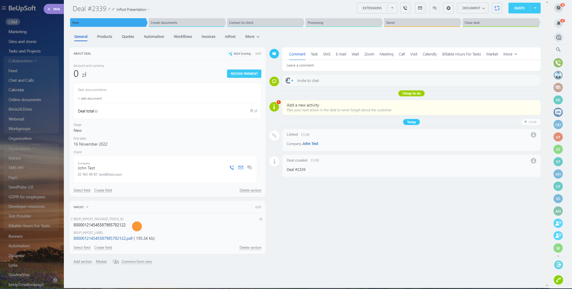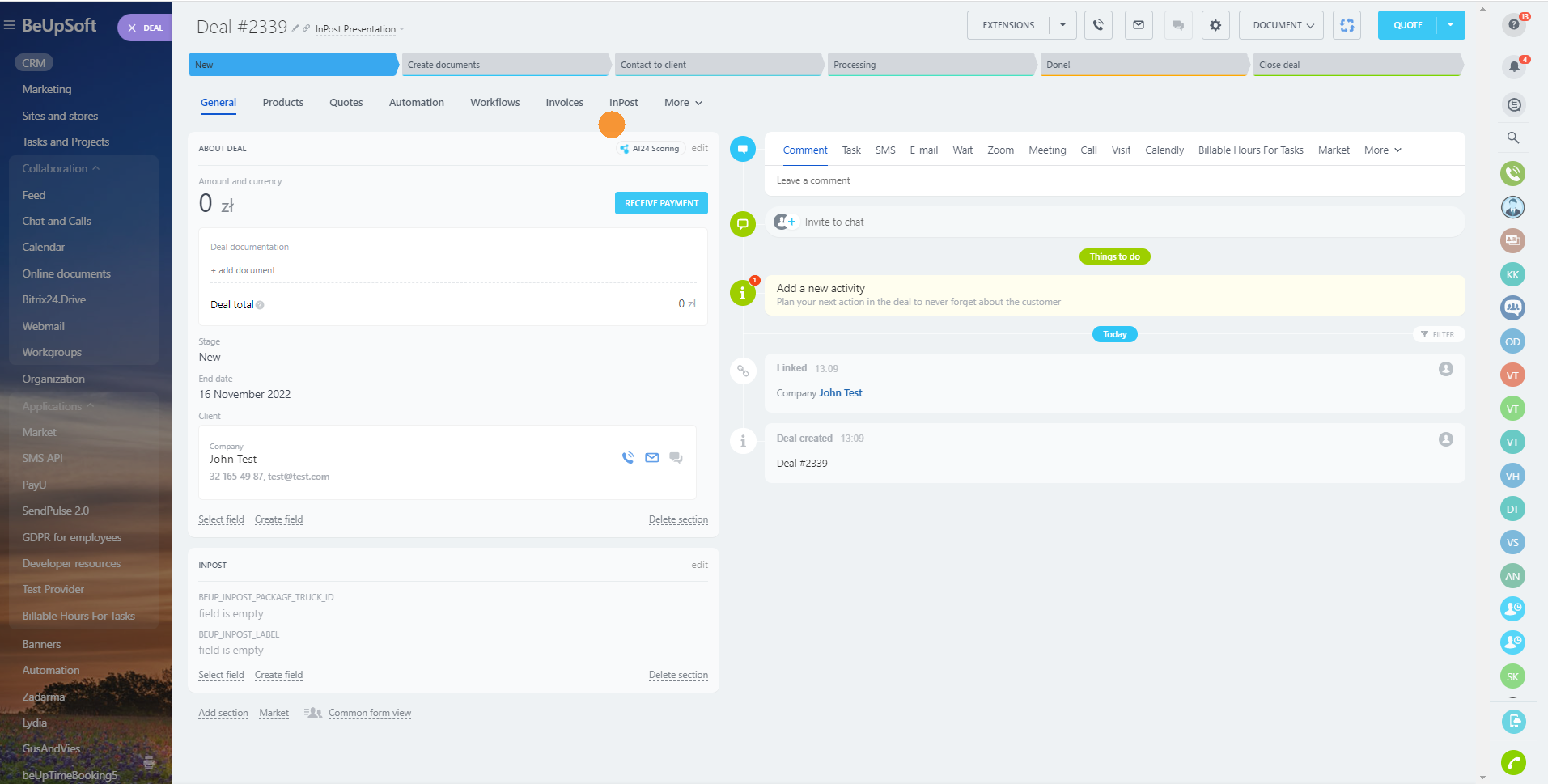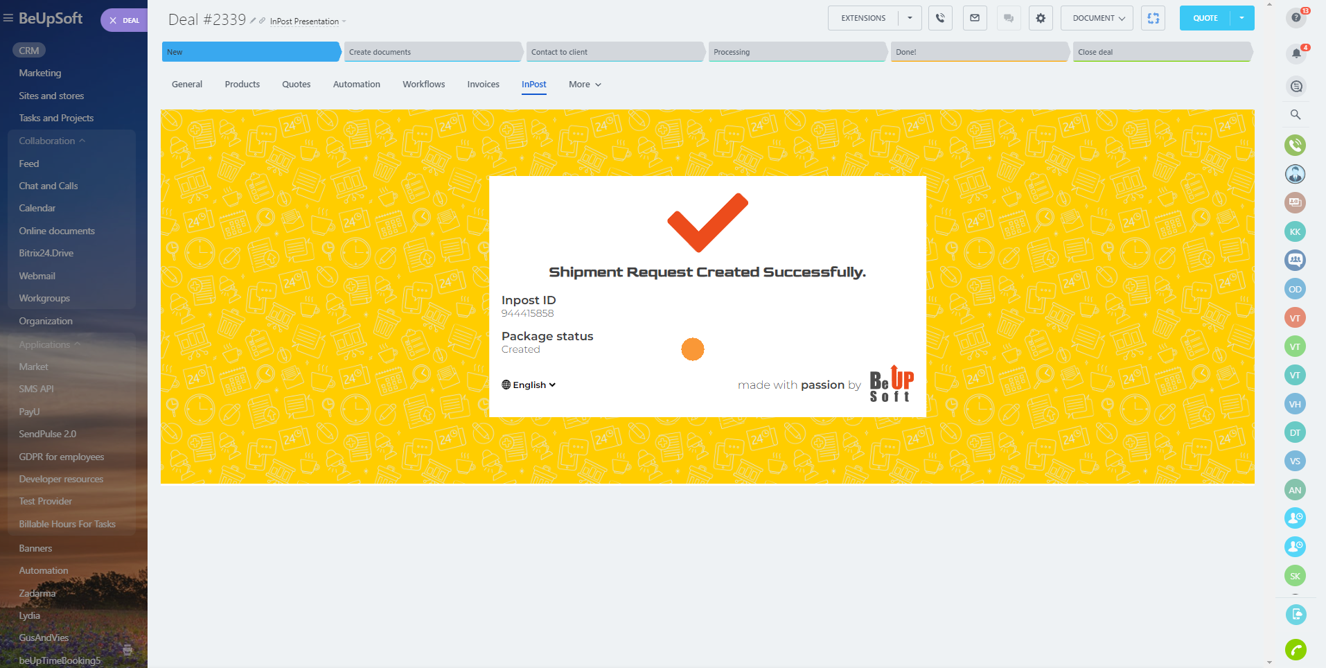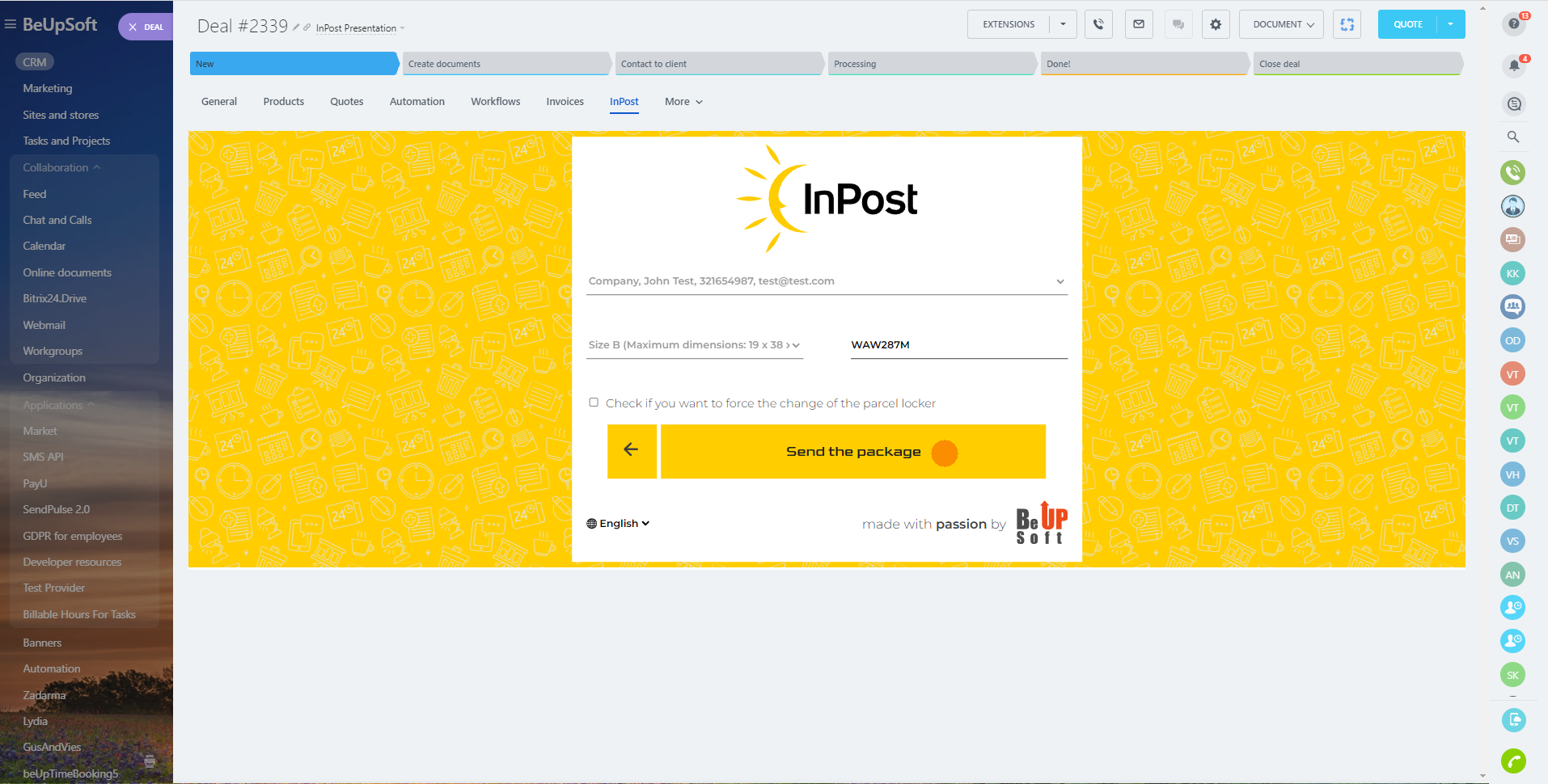 Application sends Your parcel directly from Bitrix24 deal interface. Sel ect customer/company address, pick fr om an interactive map Parcel locker, select size and thats it. You parcel is already inside InPost portal.