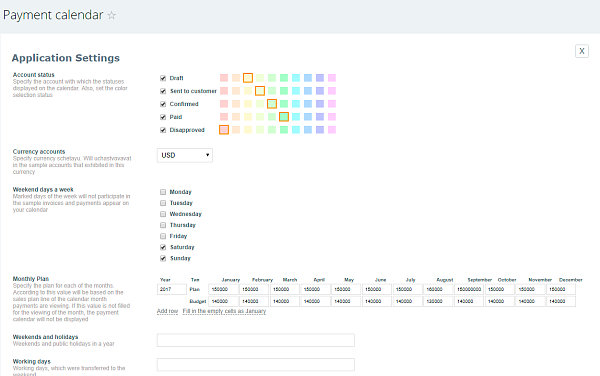 You can adjust: the value of the minimum and optimal sales plan for each month, personal status colors, weekends and working days.