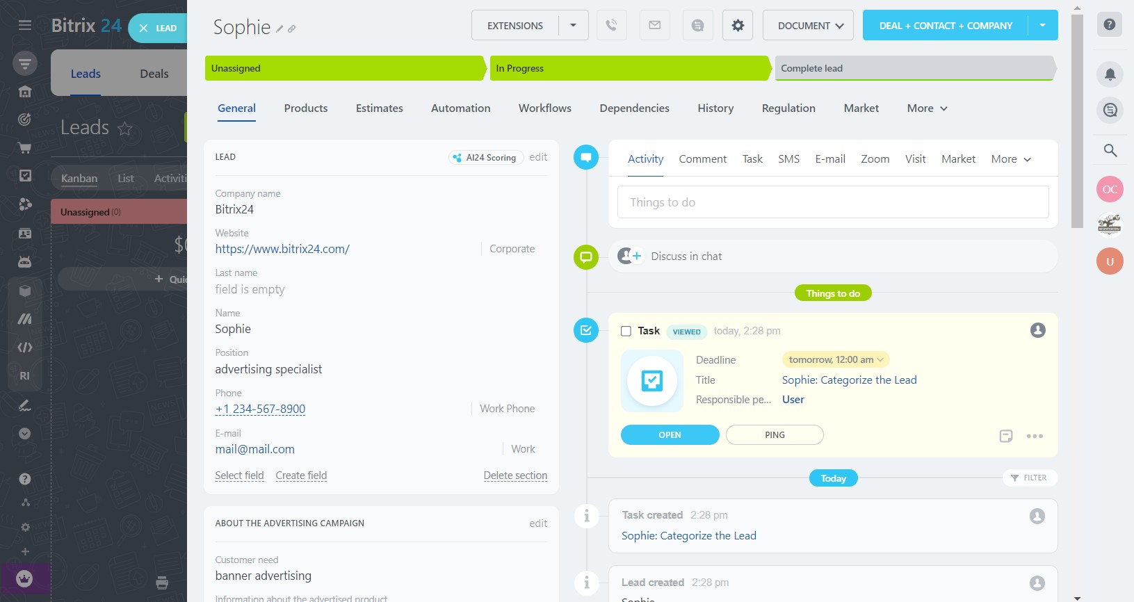 2. A convenient lead entity with all the necessary fields for collecting basic information
