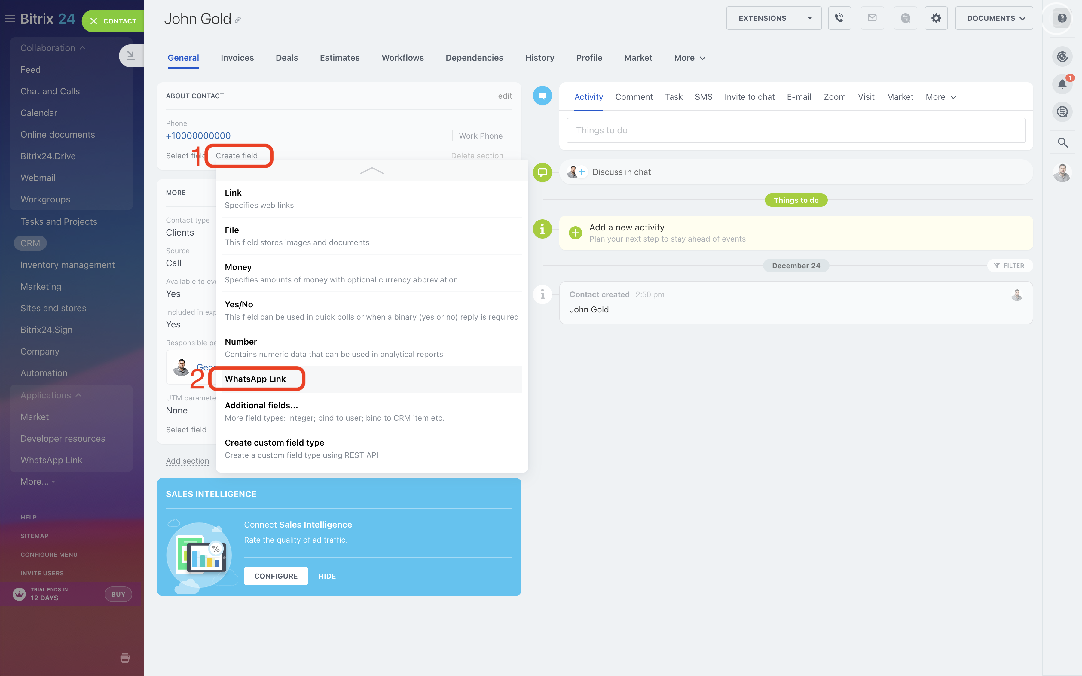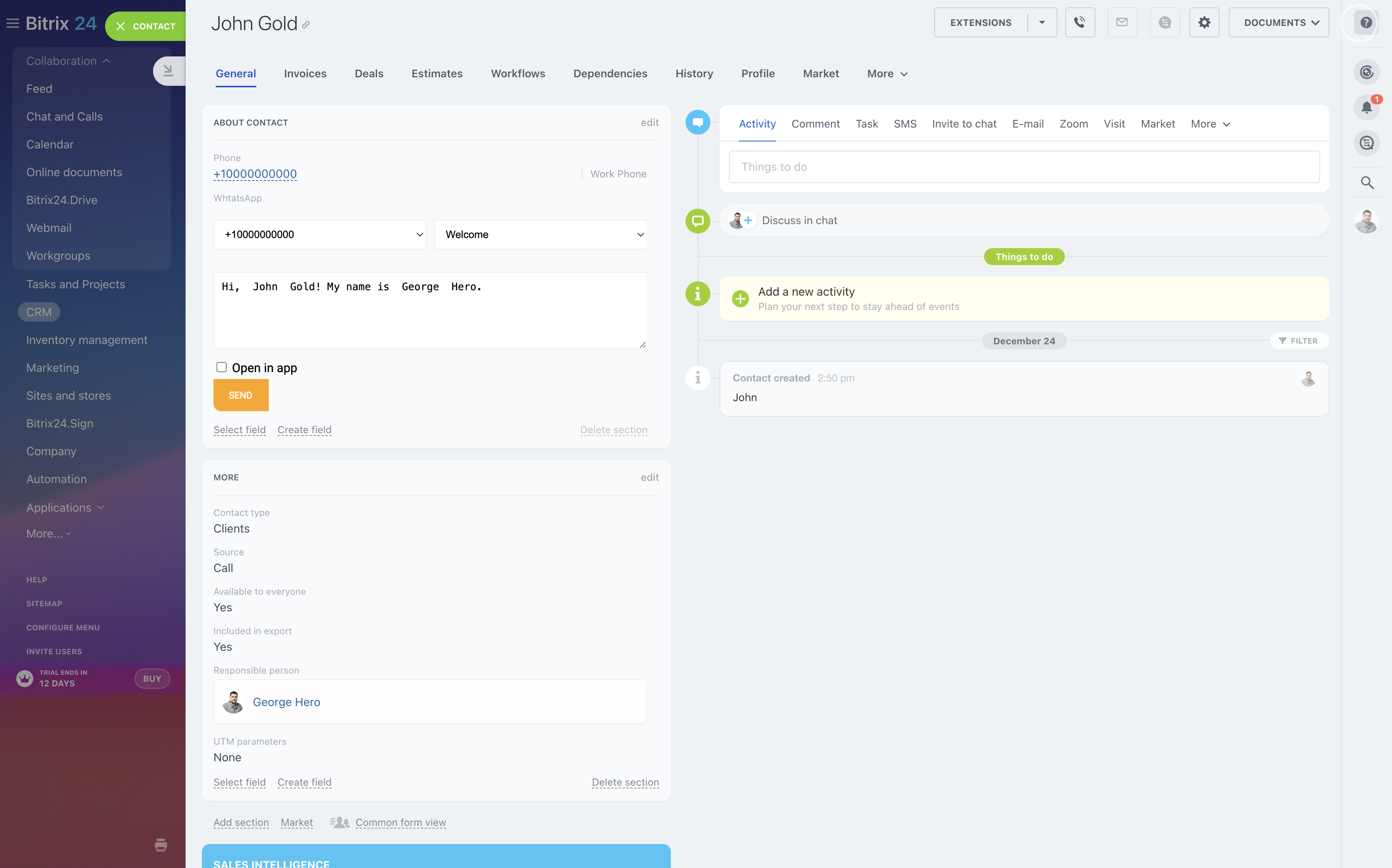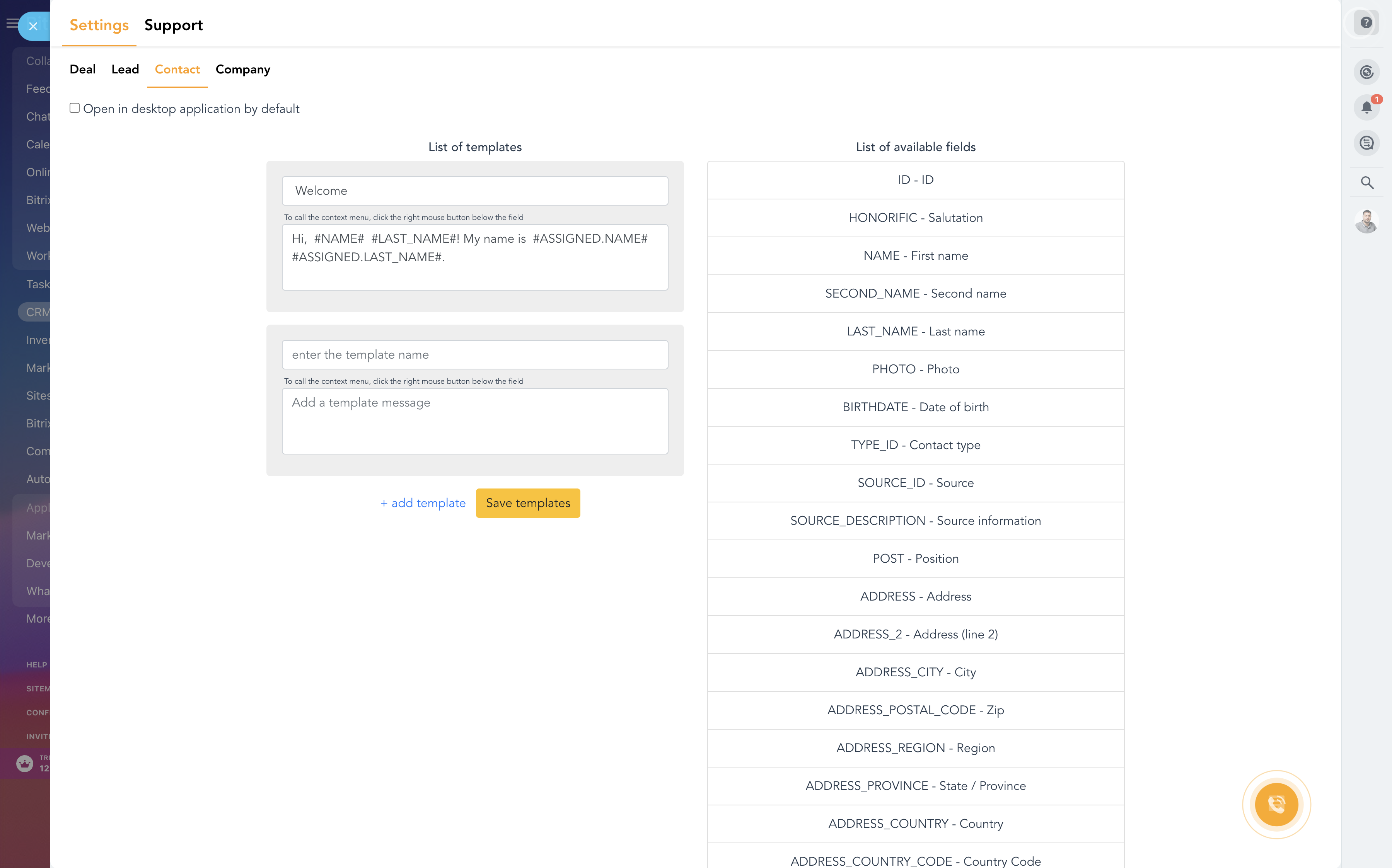 The application allows you to send messages to customers on WhatsApp from Leads, Deals, Contacts or Companies cards. You can write to clients first. When sending a message, a dialogue with the client opens in the desktop or web version of the WhatsApp application.