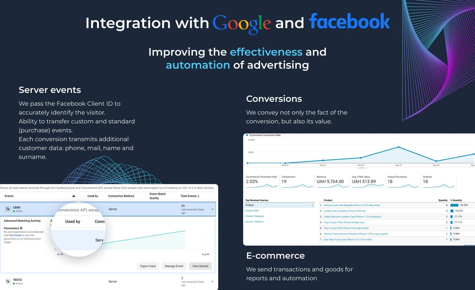 - There is no need to integrate Google and Facebook separately, because everything works through 1 plugin;