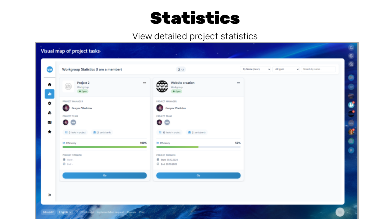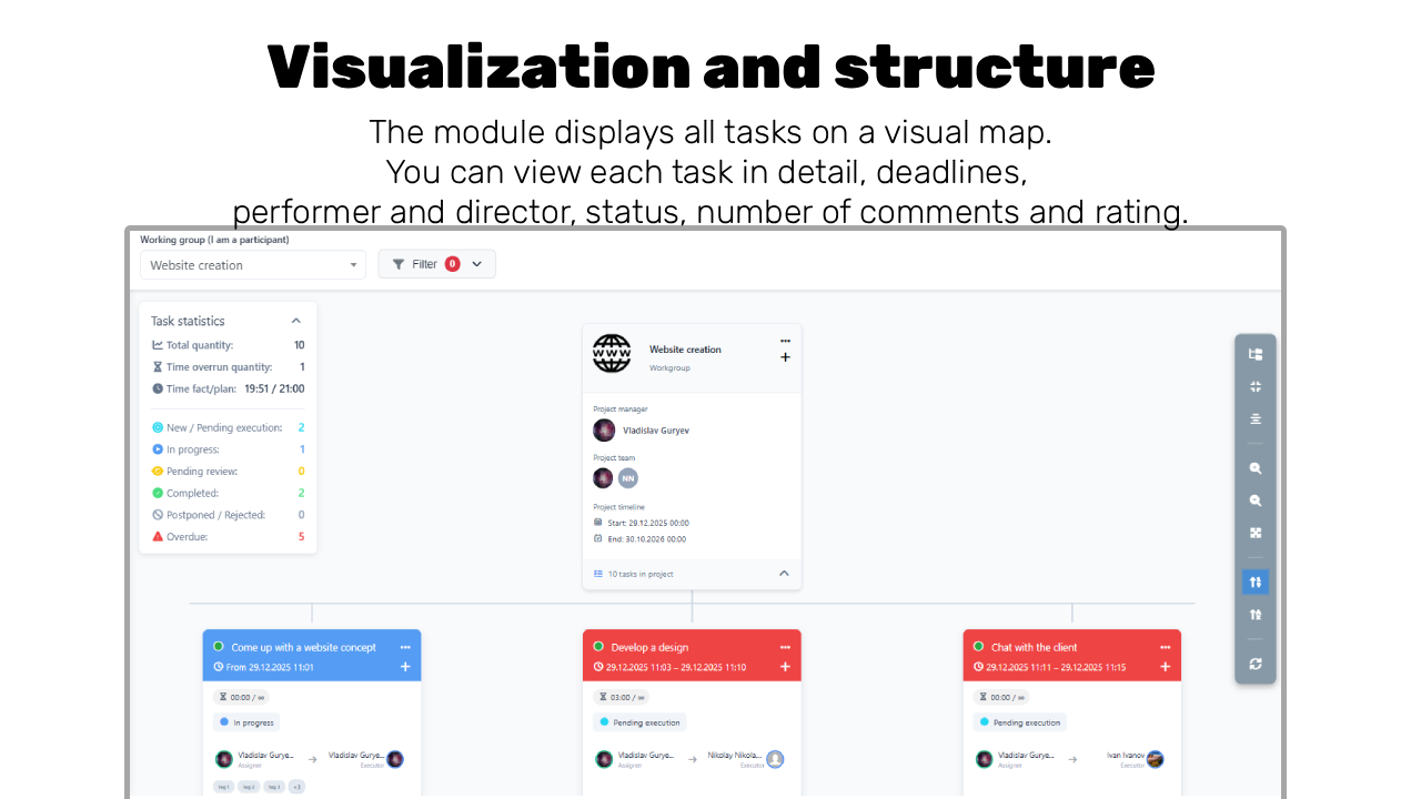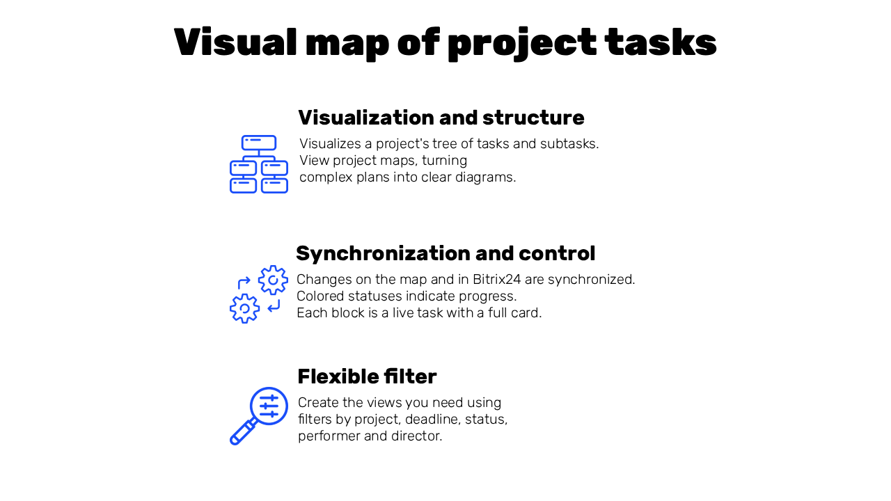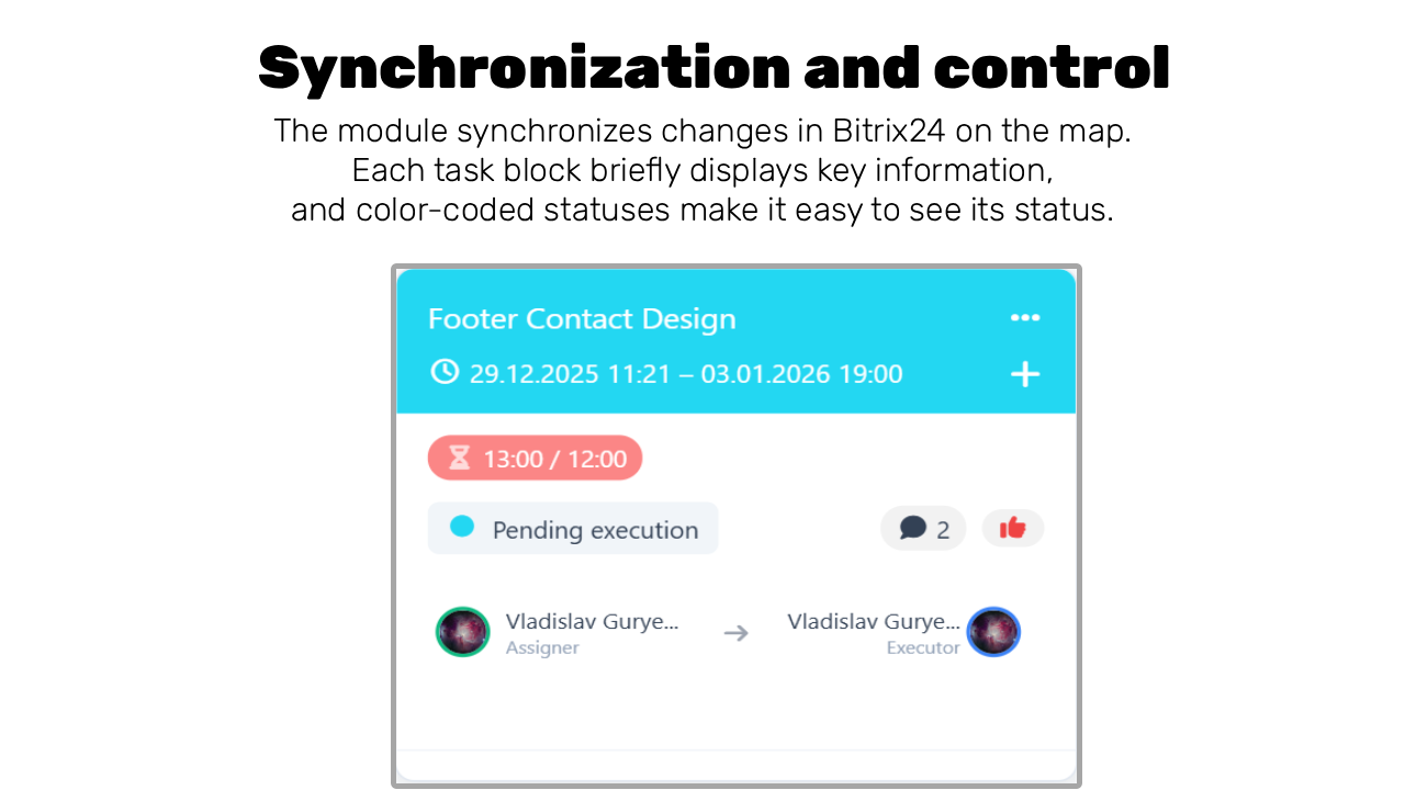✅ Two-way synchronization in real time: Any changes to the status, deadlines, or task name on the map are reflected in Bitrix24, and vice versa.