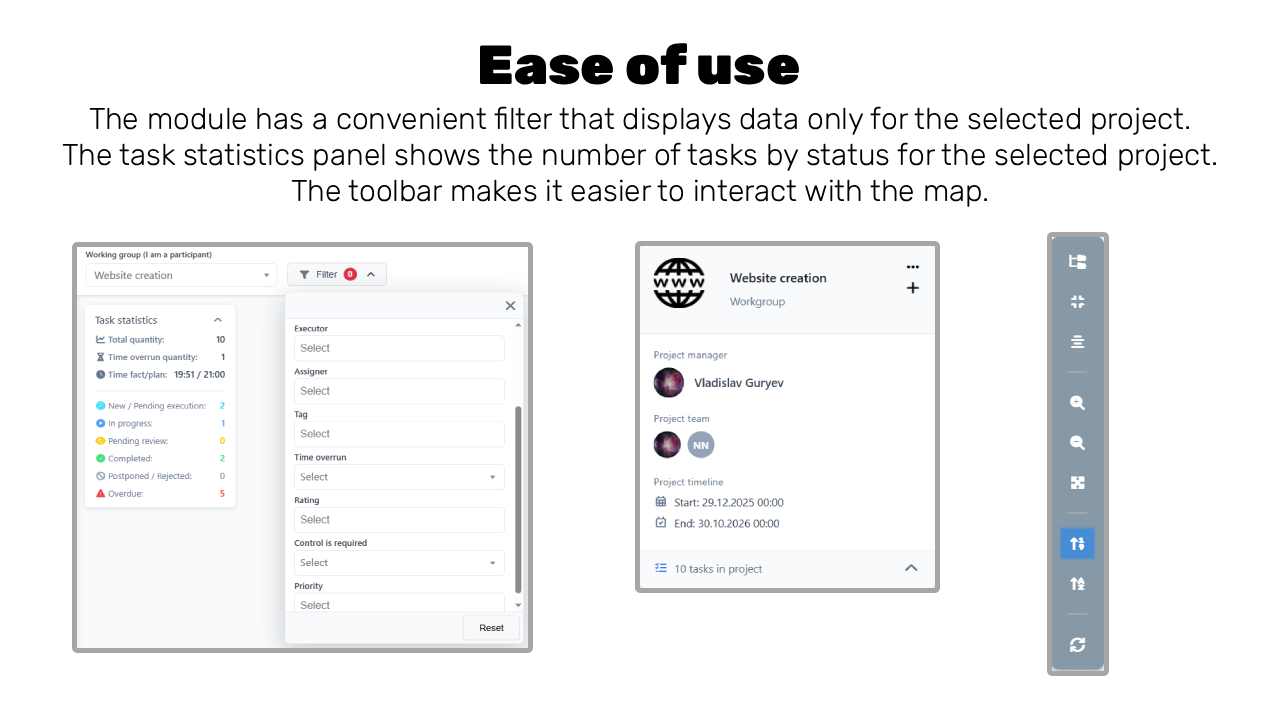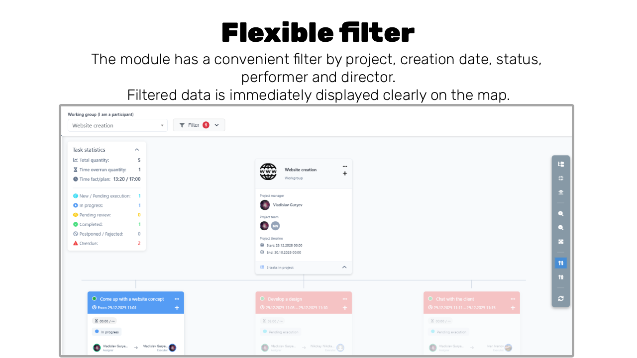 ✅ Powerful filtering system: Create the views you need by filtering the map by project, assignee, status, deadline, or task manager. Hide unnecessary details to focus on what matters.