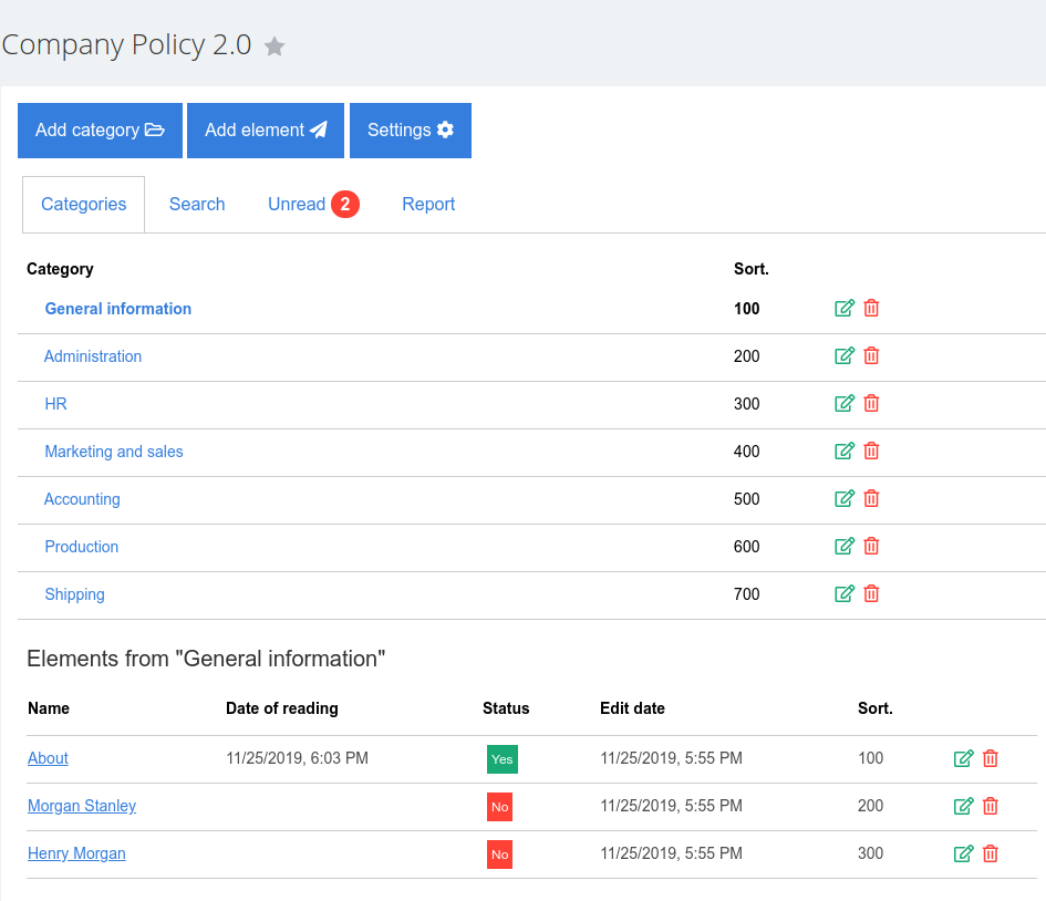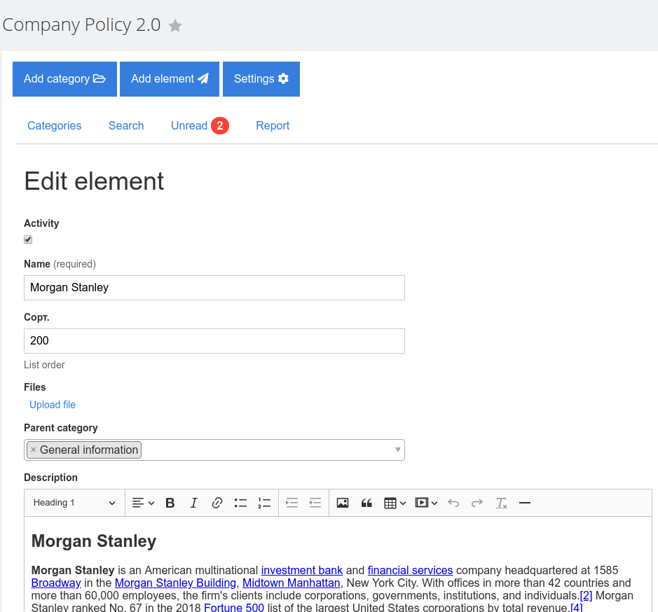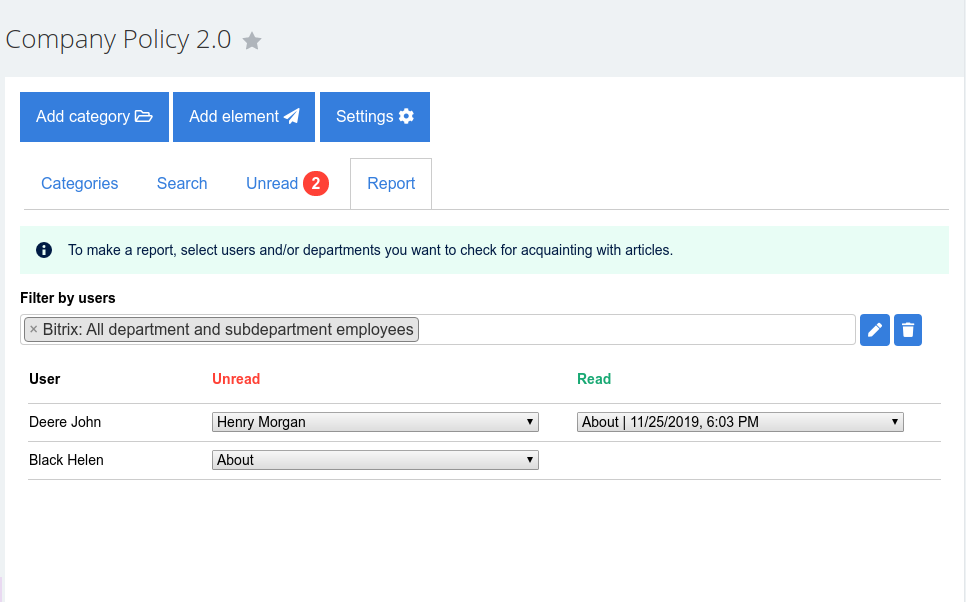- Create new documents. After adding and saving the text it appears in all employees' of this group “Did not read” section.