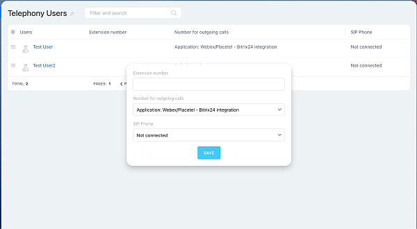 - Call directly from any contact, lead, or deal card in Bitrix24 using Webex or Placetel.