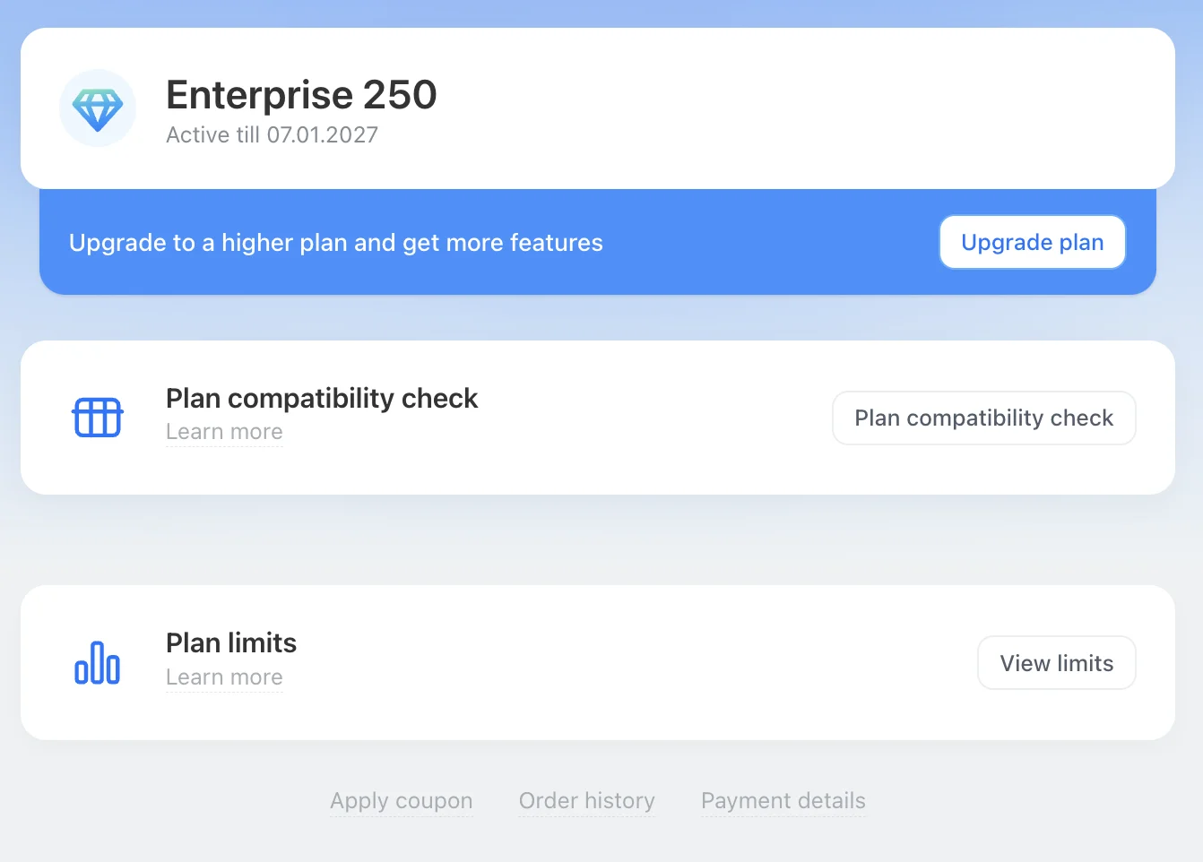 Bu bölümde; plan adı, son kullanma tarihi ve kalan gün sayısı gibi mevcut planınızla ilgili tüm bilgileri anında görebilirsiniz. Bu genel bakış, durumu kontrol altında tutmanıza ve yenileme veya plan değişikliğini önceden planlamanıza olanak tanır.
