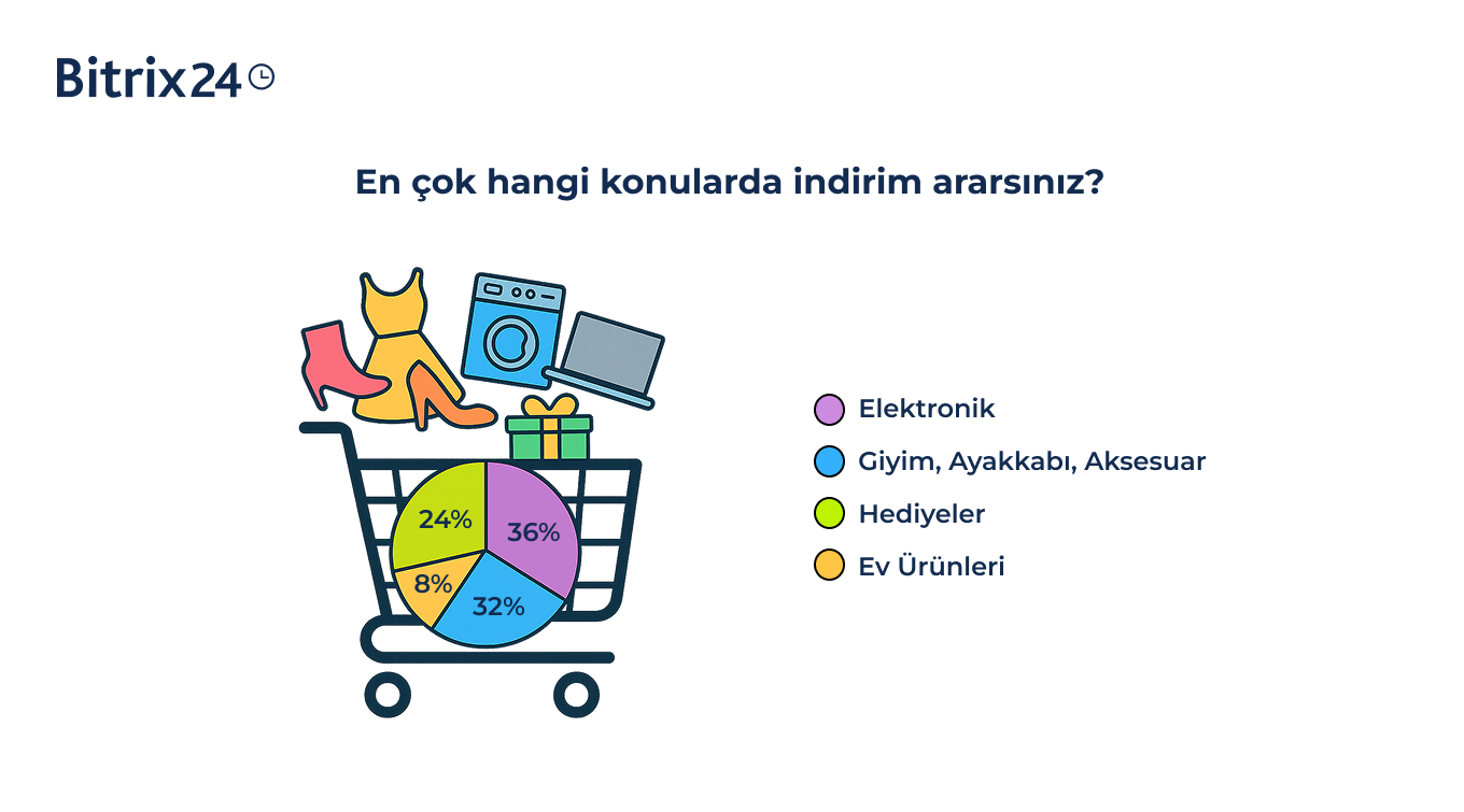 Anket sonuçlarına göre Türk tüketicisi en çok, sık yenilenen ve yüksek hacimli bir kategori olan Yeni Kıyafetler (Giyim, Ayakkabı, Aksesuar) için indirim beklemektedir. Bunu, yüksek bütçeli ve alımı ertelenen ürünleri içeren Ev Eşyaları (Mobilya, Beyaz Eşya) ve Teknolojik Aletler takip etmektedir.