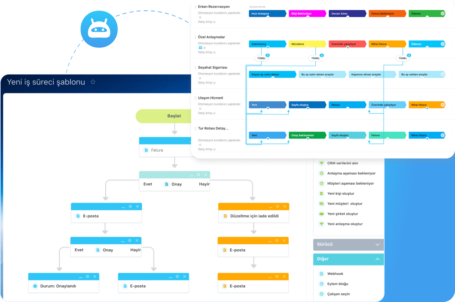SMS veya e-posta yoluyla otomatik müşteri bildirimleri ayarlayın, müşteri adaylarını/anlaşmaları satış kanalında otomatik olarak ilerletmek için özelleştirilebilir tetikleyicilerimizi kullanın, müşteri adayı/anlaşma durumuna göre satış temsilcilerinize otomatik bildirimler yapılandırın.