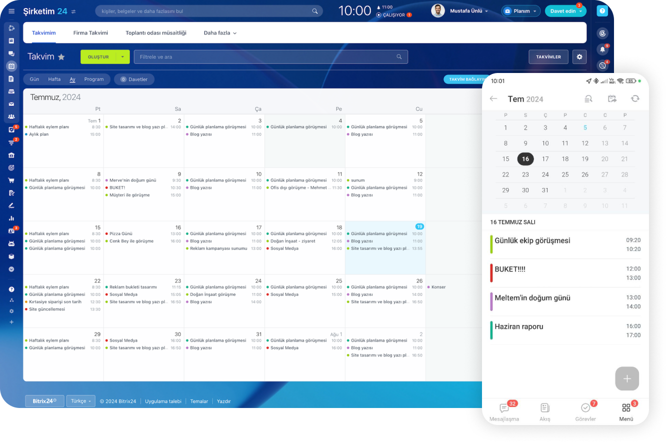 Toplantı ve etkinlikleri şık ve kolay bir şekilde düzenleyin, gününüzü planlayın ve iş yükünüzü yönetin, ekibinizle iletişim kurun ve harici kullanıcılarla iş birliği yapın: Hepsi Bitrix24 ile.