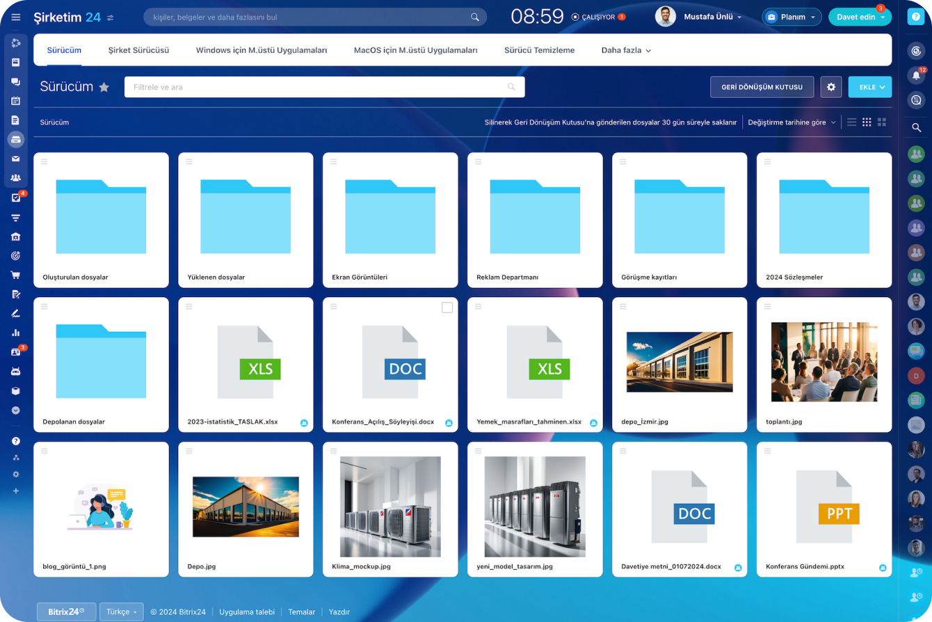 Bitrix24 Drive, işle ilgili tüm dosyaları oluşturduğunuz, düzenlediğiniz ve paylaştığınız yerdir. Herhangi bir cihazdan kolayca erişilebilir, Google Dokümanlar, Office 365 ve Bitrix24 satış üretkenliği araçlarının geri kalanıyla entegre: Bir dosya depolama alanından isteyebileceğiniz her şey burada.