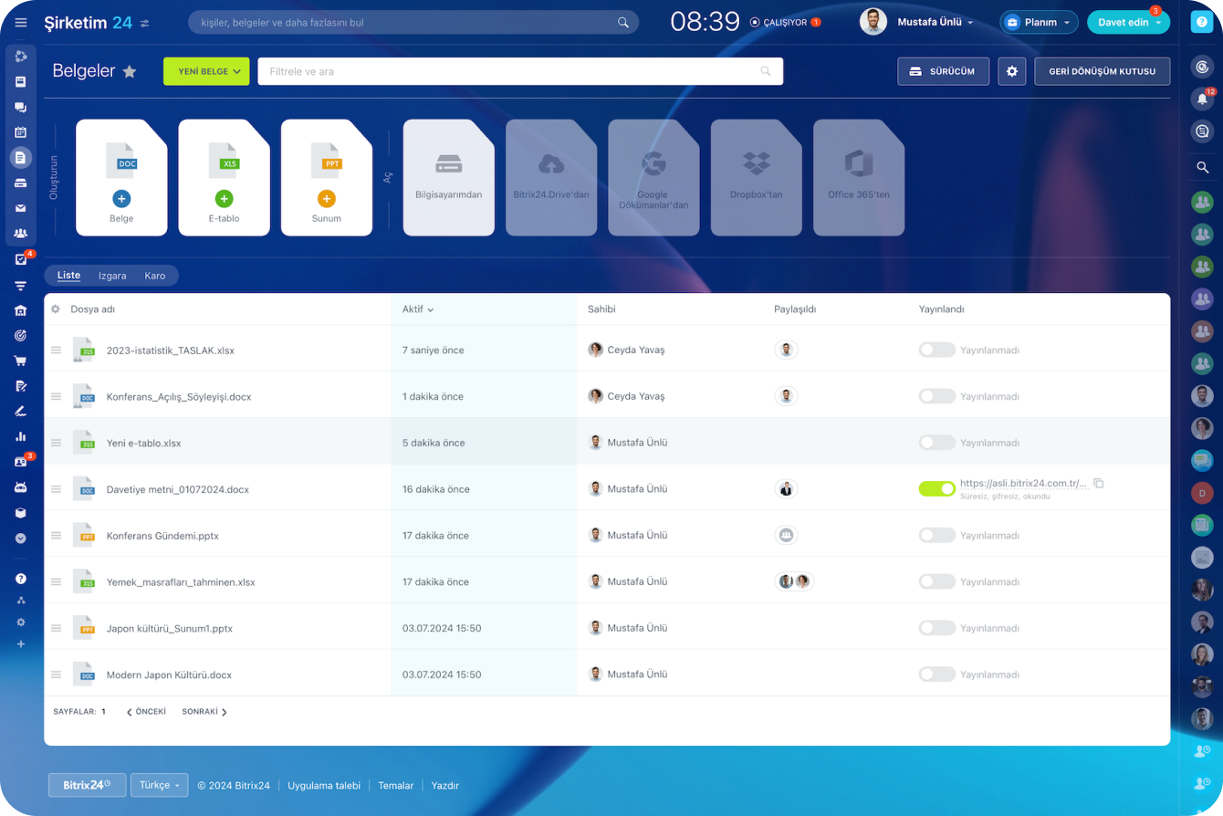 Bitrix24 içinde belge yükleyin, oluşturun, görüntüleyin, birlikte düzenleyin ve hem iş arkadaşlarınızla hem de harici kullanıcılarla paylaşın. Tüm popüler dosya formatlarını destekler ve bu da yalnızca düz metin belgeleriyle değil, elektronik tablolar ve sunumlarla da çalışabileceğiniz anlamına gelir.