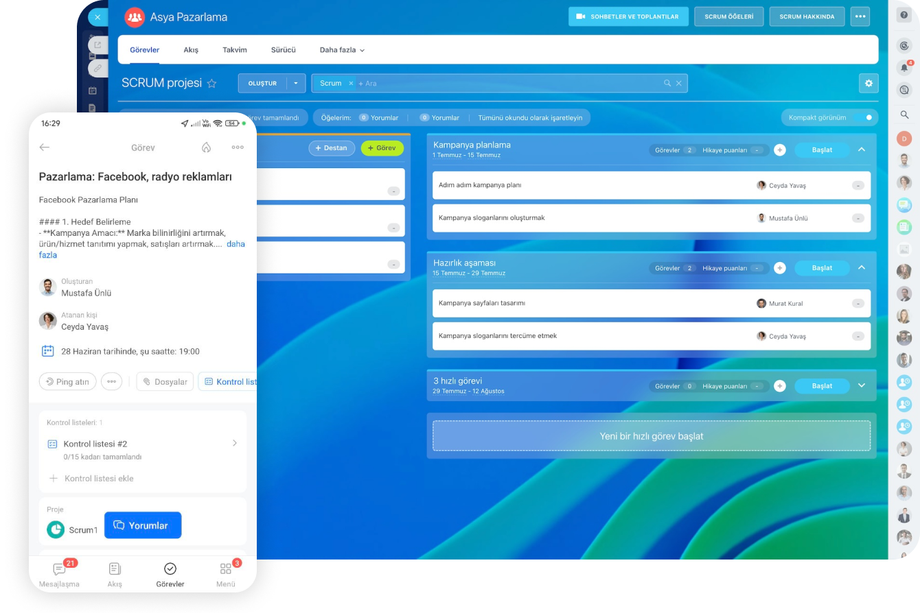 Tercihlerinize bağlı olarak 5 farklı görev görüntüleme modu arasından seçim yapın: Scrum, Liste, Kanban, Planlayıcı ve Gantt şeması.