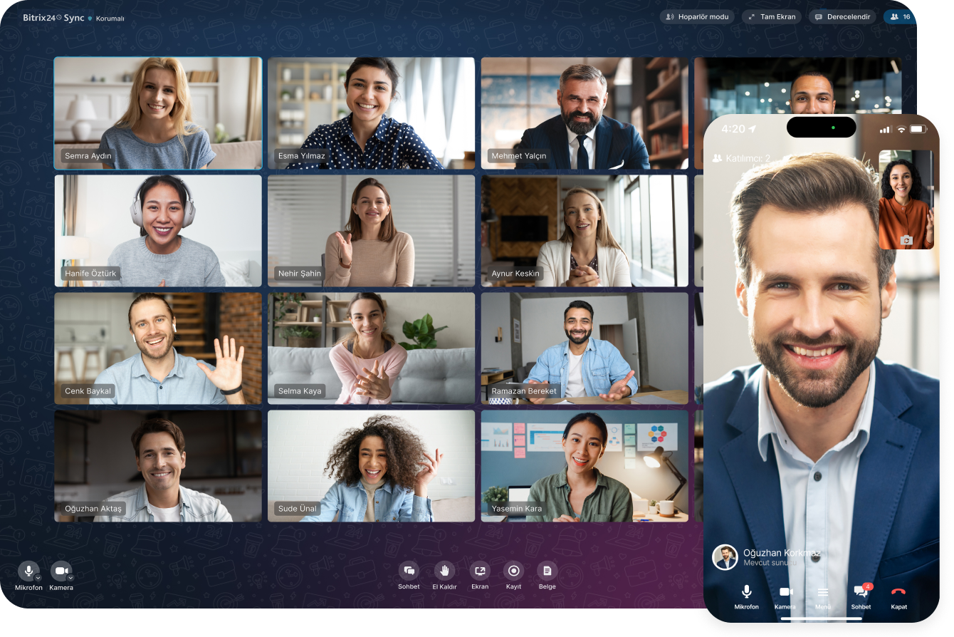 İş arkadaşlarınıza önemli bilgileri göstermek için günlük bir satış toplantısı sırasında ekranınızı paylaşın. Toplantı kaydedilebilir ve Bitrix24 Drive'ınıza kaydedilebilir.