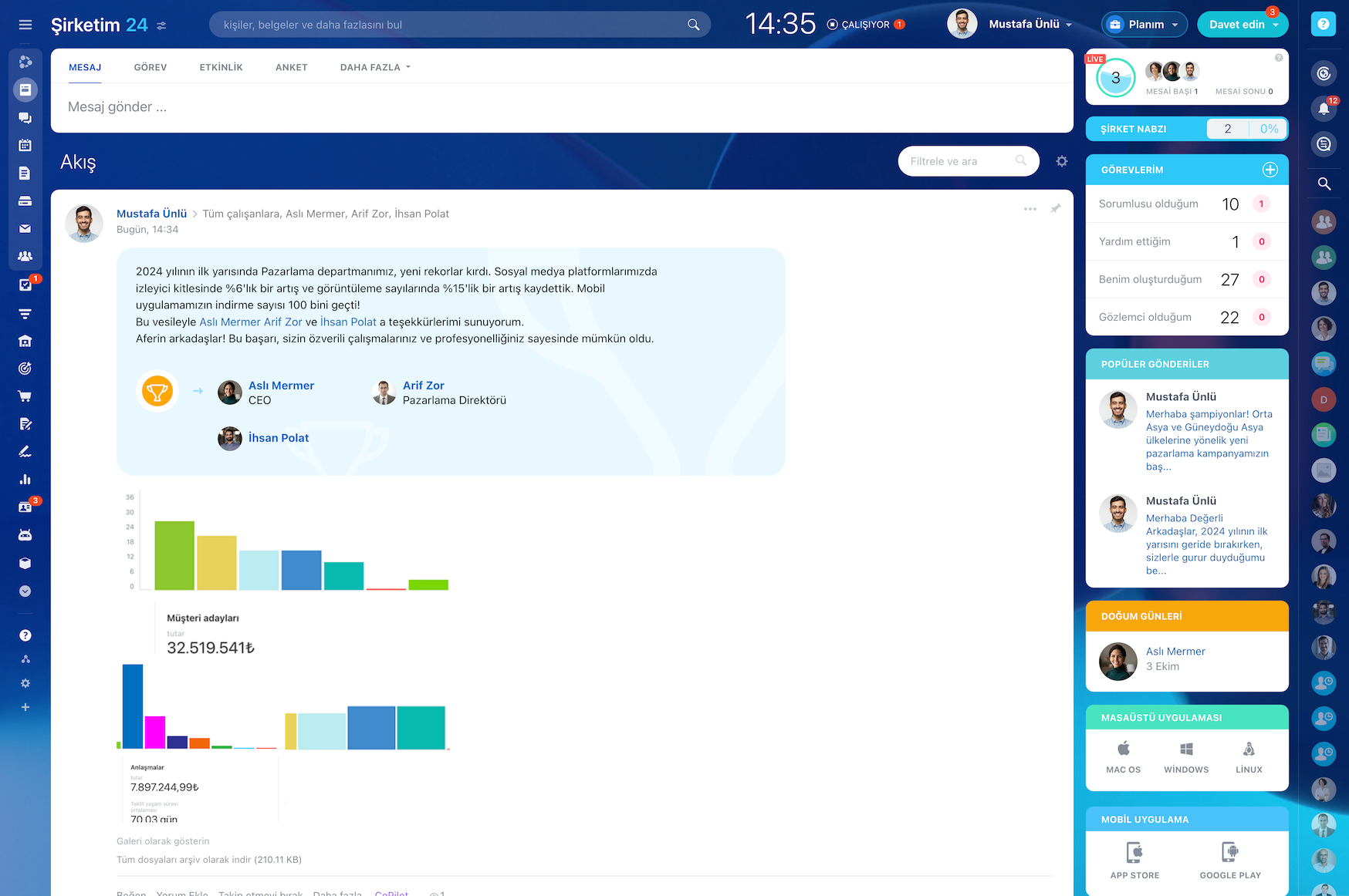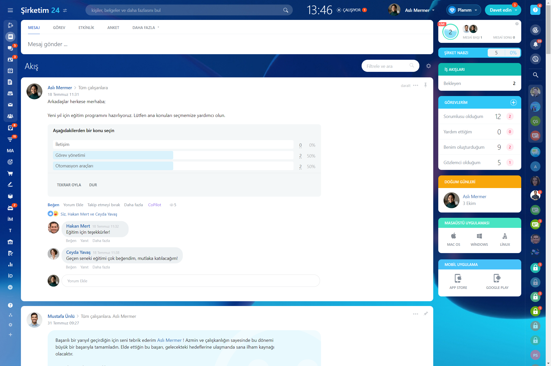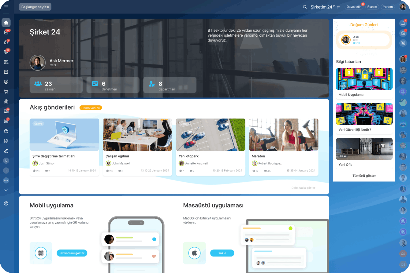 Bitrix24, ekibiniz içinde sosyal etkileşimleri teşvik etmenize ve şirket kültürünü işleriyle bağlantılı olarak doğal bir şekilde geliştirmenize yardımcı olur.