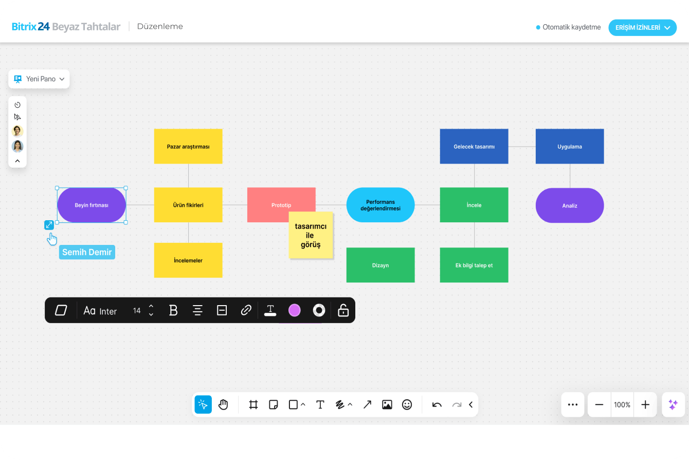 Panolar, strateji oturumları ve tasarım sprint'lerinden iş akışı görselleştirme ve proje haritalamaya kadar ekibinizin düzenli, yaratıcı ve bağlantıda kalmasını sağlar.