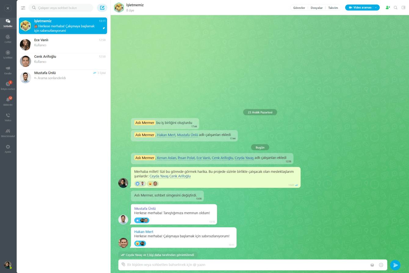 Bitrix24 Mesajlaşma aracı, diğer iş birliği araçlarımız ve CRM ile organik olarak bağlantılı, hızlı, üretken ve güvenli iletişim sağlar.
