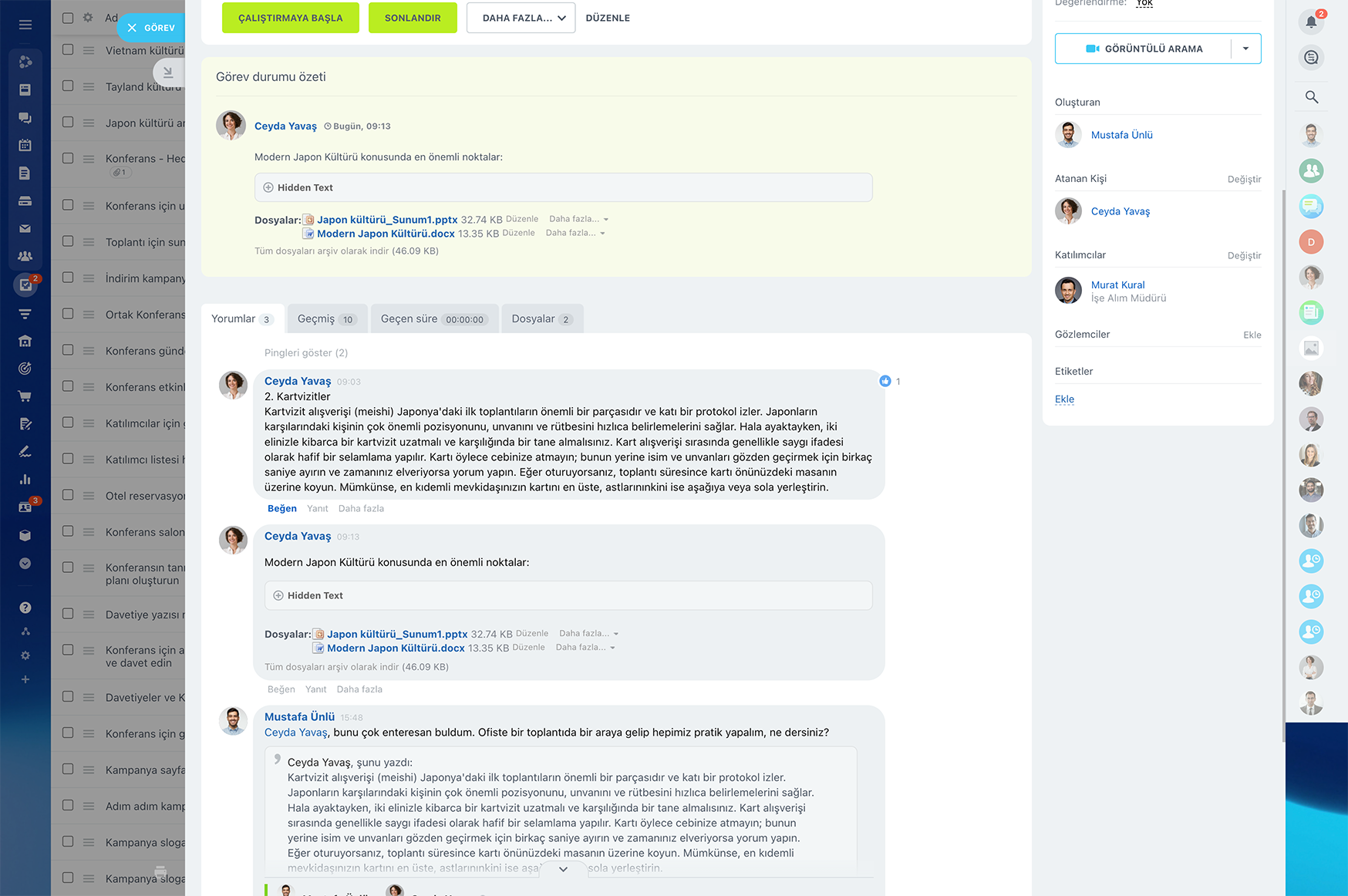 Sohbetten, görevden, takvim etkinliğinden, hatta CRM'deki bir müşteri adayından veya anlaşmadan hızlı bir şekilde çevrimiçi bir toplantı ayarlayabilirsiniz. Görev yönetimi iş birliği için gerçekten yararlı bir araçtır.