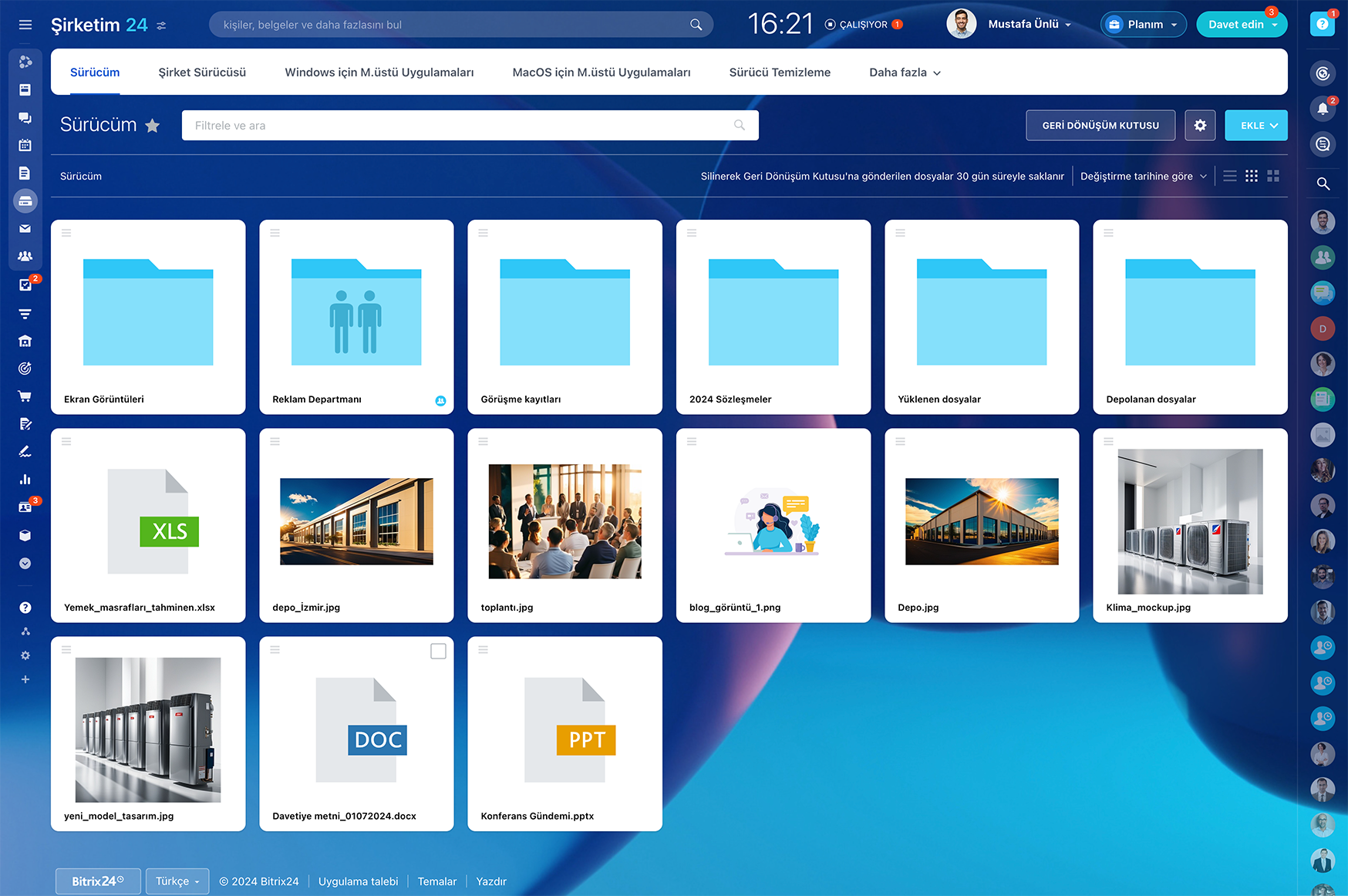 Bitrix24 size işle ilgili her türlü dosyayı oluşturabileceğiniz, düzenleyebileceğiniz ve paylaşabileceğiniz bir bulut dosya depolama alanı sağlar. Hem masaüstü hem de mobil cihazlardan kolayca erişilebilen, Google Dokümanlar ve Office 365 ile entegre olan Bitrix24 Drive, çevrimiçi proje iş birliği ihtiyaçlarınız için mükemmel bir seçimdir.