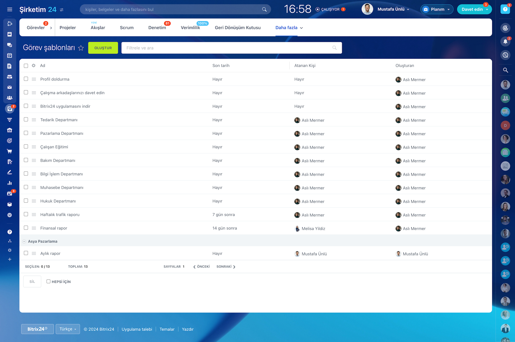 Sık sık aynı görevi tekrar tekrar atamanız gerekiyorsa neden bunu bir şablona dönüştürüp kendinize bol bol zaman kazandırmayasınız? Bitrix24 tam olarak bunu yapmanızı sağlar.