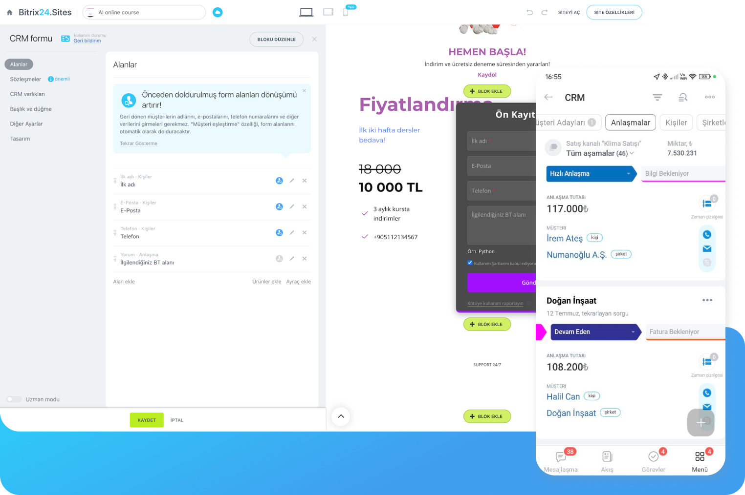 Bitrix24 CRM ve çevrimiçi pazarlama araçlarıyla tamamen entegre olan güzel siteler, açılış sayfaları ve çevrimiçi mağazalar oluşturmak için sezgisel ve kodsuz web sitesi oluşturucumuzu kullanın.